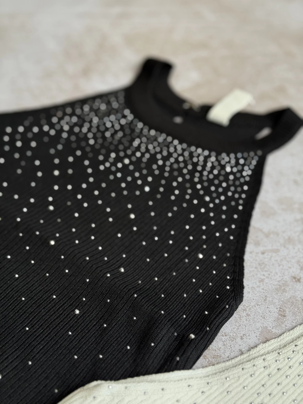 Descubrí la Musculosa Glow Hilo, una prenda tejida con punto elástico que se adapta perfectamente a tu cuerpo. Su diseño incluye un delicado broche en el cuello y un frente totalmente adornado con strass que aportan un brillo irresistible. Ideal para deslumbrar en cualquier ocasión, combina estilo y comodidad en una sola pieza.